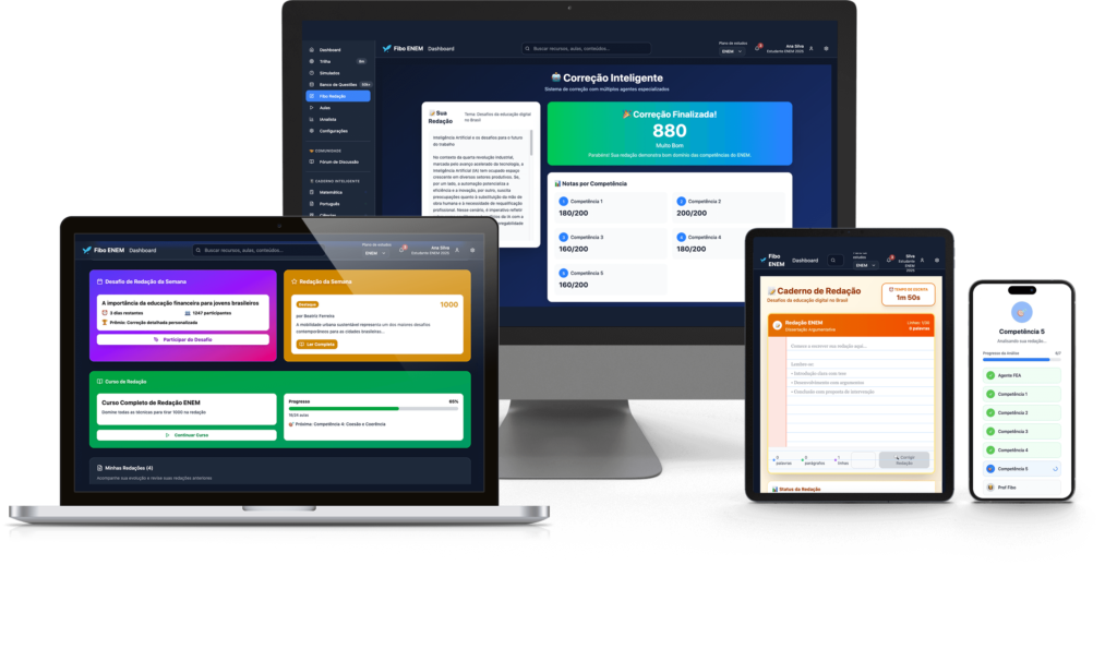 No Fibo Redação, você encontra todas as ferramentas para ampliação de repertório, para exercitar a sua escrita e receber correções qualificadas, completamente alinhadas às 5 competências do Enem, evoluindo a sua redação e a sua consciência textual para poder conquistar uma nota excelente na redação do Enem.