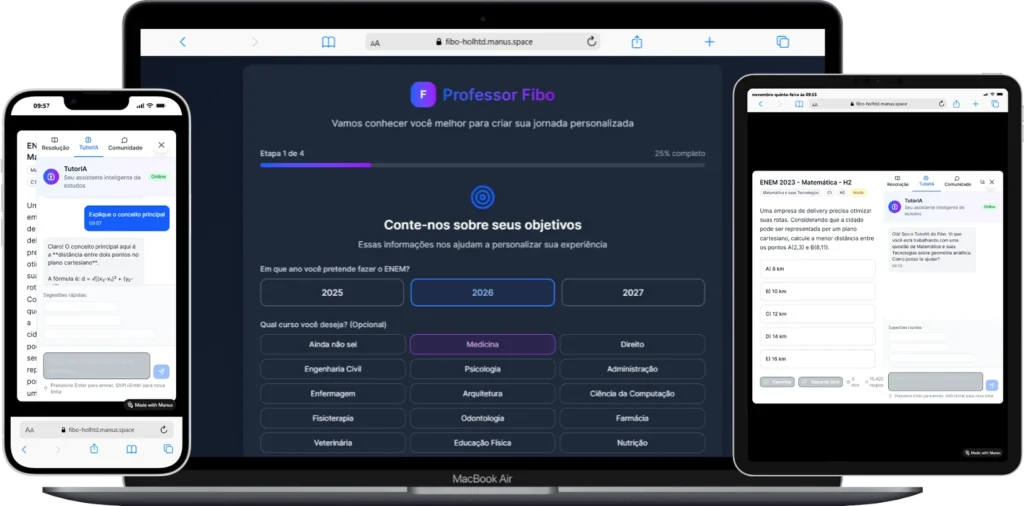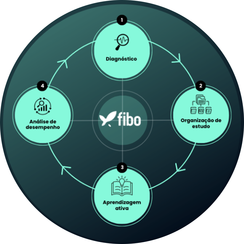 O Professor Fibo é o seu mentor inteligente dentro da plataforma. Ele analisa seu desempenho em tempo real, compreende suas metas e estrutura um plano de estudos verdadeiramente personalizado. Além disso, você pode tirar dúvidas diretamente com ele, solicitar revisões de explicações, reforçar conteúdos específicos e até aprofundar tópicos de forma guiada. Tudo isso através de uma inteligência artificial que raciocina e gera uma memória específica para você, acompanhando cada etapa do seu progresso.