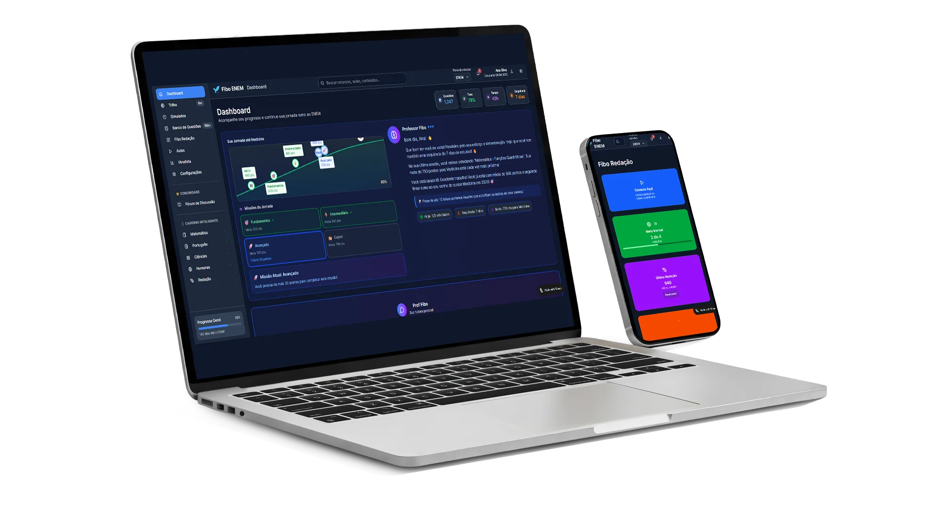 O IAnalista Fibo é seu especialista em análise de desempenho para o ENEM. Ele interpreta seus resultados, identifica padrões de acertos e erros, monitora sua evolução por área e habilidade e traduz tudo em orientações claras para otimizar seu estudo.Aqui, você vê seu progresso em gráficos claros e observe a IA ajustar a sua rota em tempo real.